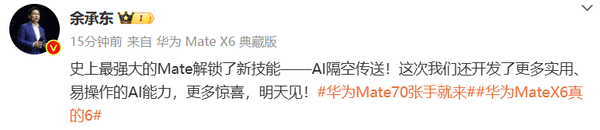余承东:华为Mate 70系列解锁“AI隔空传送”新技巧