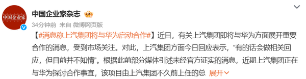 上汽集团恢复将与华为运转互助:有的话会作念干系恢复云开体育