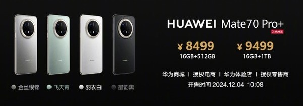 华为Mate60 Pro+的价钱分散为8999元和9999元,对比下来,Mate70 Pro+少了500元。