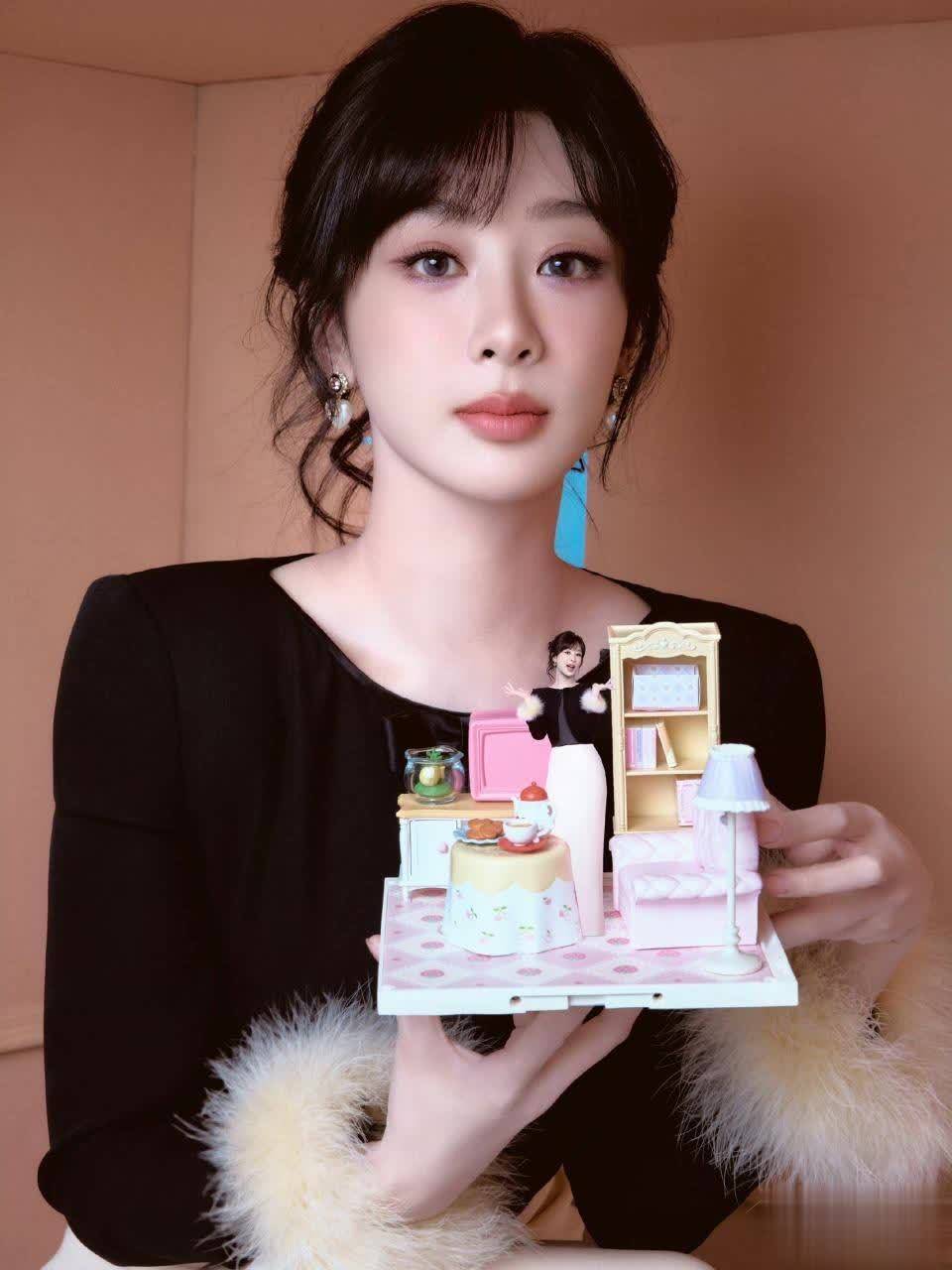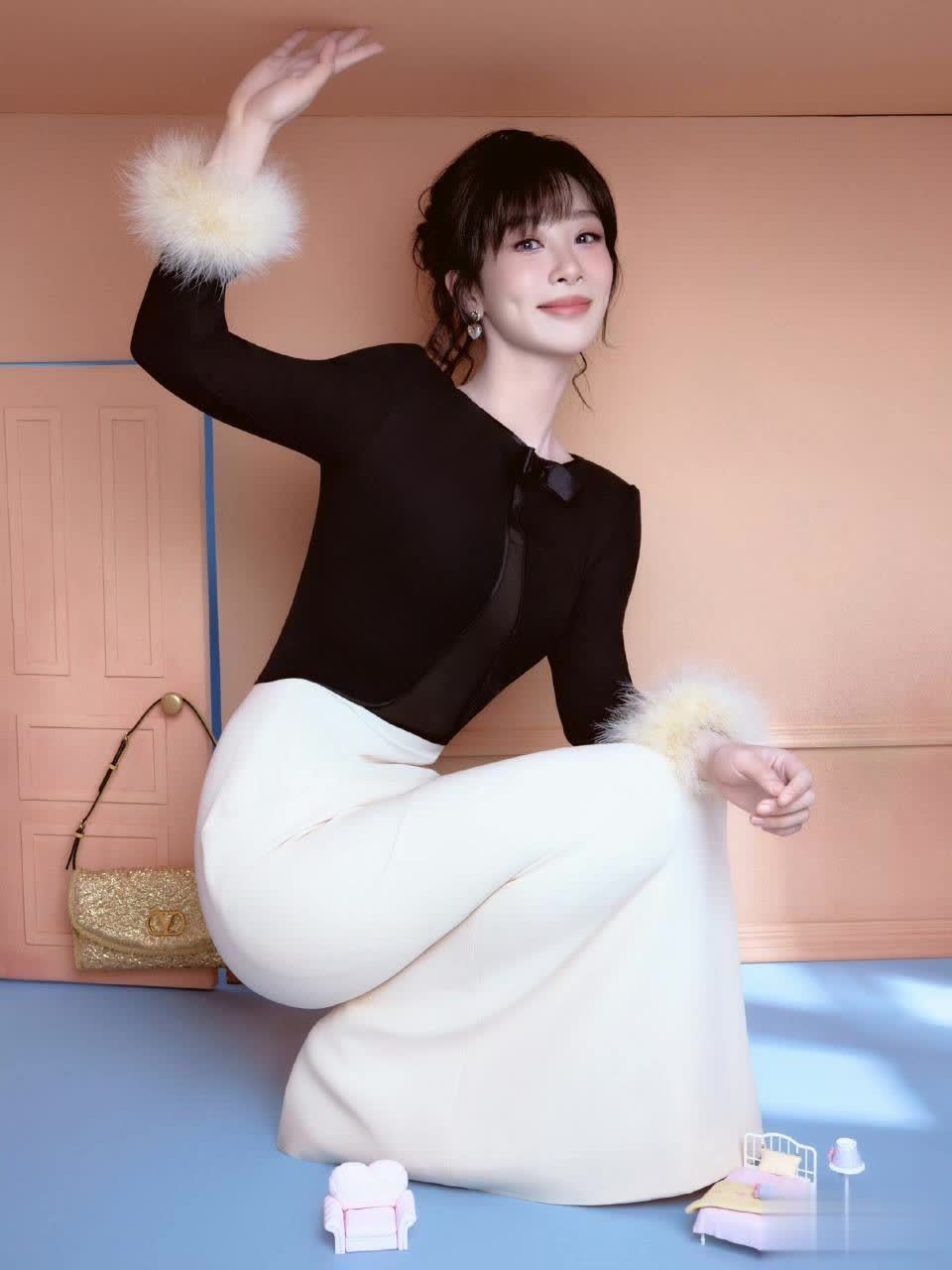 玄色蝴蝶结上衣与米白长裙的碰撞,一刹将程序残害拉满!王人刘海短发下的杨紫眼眸微笑,蓬松毛绒袖口增添灵动感。她鄙俗倚靠窗边,手举白色小物件的姿态看似随心,实则遮挡巧想——金色手提包与地上的迷你沙发、小床模子,仿佛在诉说一个童话般的袖珍戏院。这组造型完整讲授了她“甜而不腻”的气质。