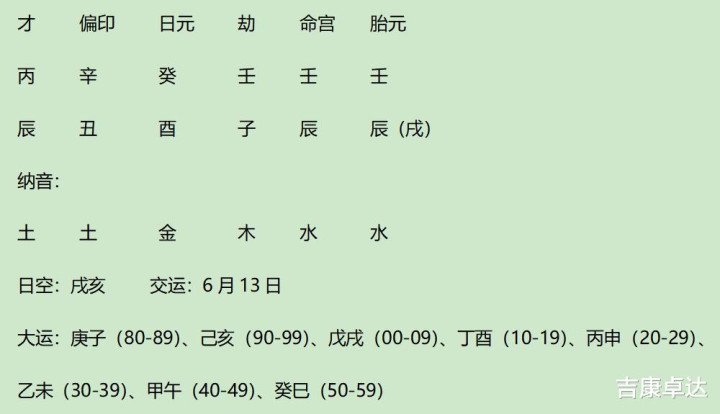 己杀制壬劫,小限丙财合辛偏印;大运亥与月支丑拱子,流年申与命宫辰拱子,小限子合辰,3子暗冲1午,午合戌。