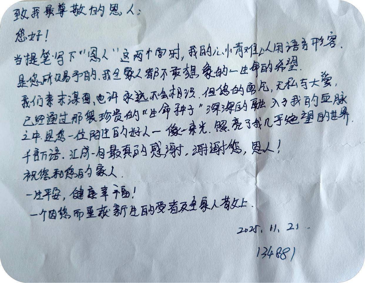 2025年5月,曹先生再次接到深圳市血液中心的电话——他与另别称患者配型到手!10月10日会聚高分别血样,11月2日完成体检,12月3日到手捐献,悉数这个词经由高效而沉稳。当深圳血液中心的志愿者将一封来自受捐者的手写信交到他手中时,这段跳跃死活、衔接两个生分人命的因缘终于到手牵手。