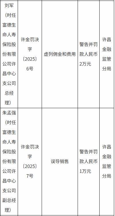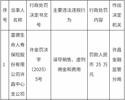 【大河财立方音问】10月15日,国度金融监督处分总局许昌监管分局表示的行政处罚信息走漏,因误导销售、虚列佣金和用度,富德生命东谈主寿保障股份有限公司许昌中心支公司被罚25万元。