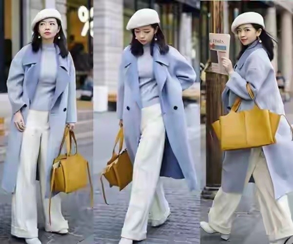 我们还可以尝试选拔雾霾蓝的大衣外衣,内搭同色系的真挚衣服单品,下半身平直用最为百搭的白色直筒阔腿裤,脚上穿的皮质的白色粗跟单鞋,头上戴了一顶白色的贝雷帽,这么的穿搭让你看起来更有活力,并且御寒又本心。