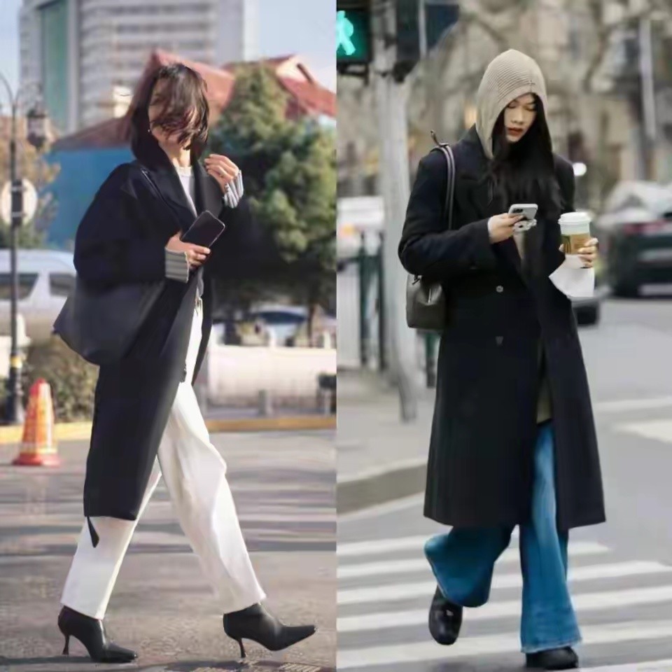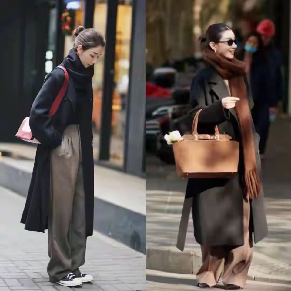 左边的这一套搭配,不太保举,用宽松的大衣外衣搭配上烟管裤,并且中筒靴如故有褶皱的版型,穿在脚上,举座嗅觉就显得莫得那么利落,并且大衣外衣还有点让东说念主臃肿臃肿。